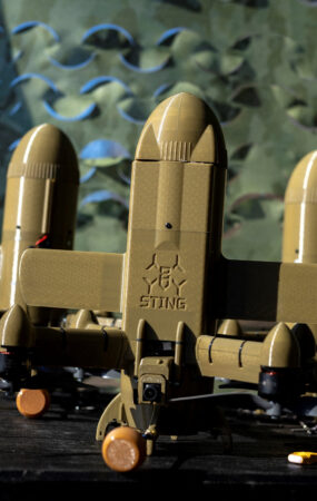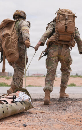 Bailey Magers and Sunil Kumar cut strange figures on Pensacola Beach. Bags of disinfectant solution surrounded them on the white