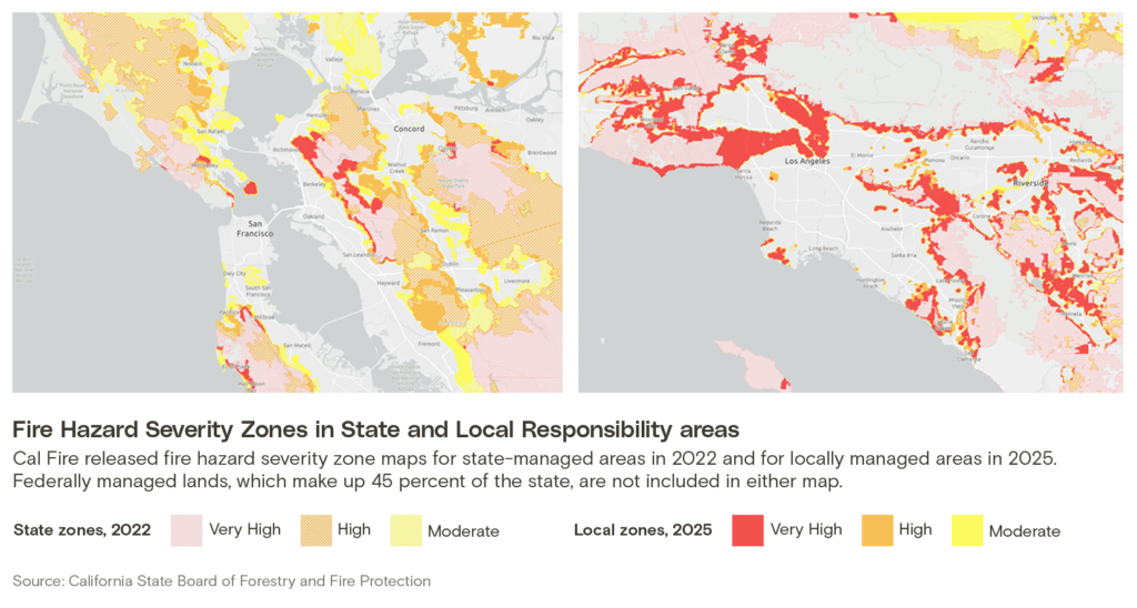 Cal Fire’s refreshed maps show a large increase in areas considered hazardous: “High” and “very high” hazard zones have grown by 168 percent since 2011. That’s partly because computing power has improved in the last 14 years, but also because more detailed data on weather patterns, vegetation, and fire behavior have made the maps more robust.