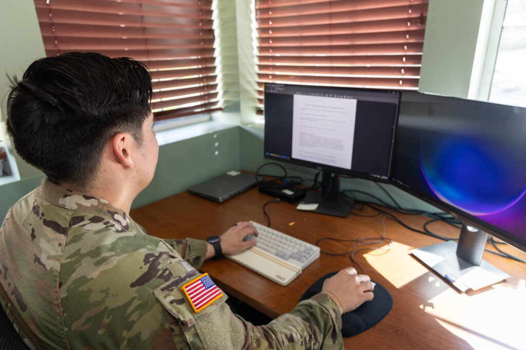Spc. Alliance Uwase conducts online training at the Army Reserve Center in Millington, Tennessee. (George Guiterrez/Army)