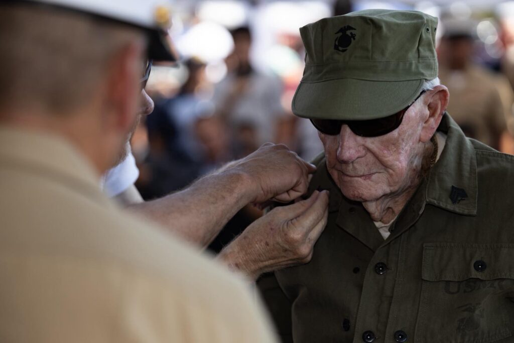 He was bayoneted in Guam. Shot on Iwo. Now, at 100, he is a sergeant.