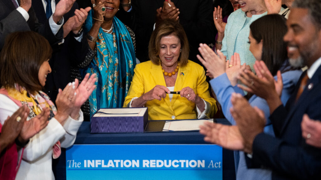 House Democrats applaud after Speaker of the House Nancy Pelosi signed the Inflation Reduction Act, a bill with $369 billion in tax breaks and other funding for clean energy programs.